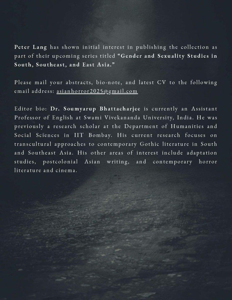 Submissions are welcome for a collection on Asian horror film – Spectral Boundaries: Gender and Sexuality in Asian Horror Film, edited by one of our members, Soumyarup Bhattacharjee, for Peter Lang.