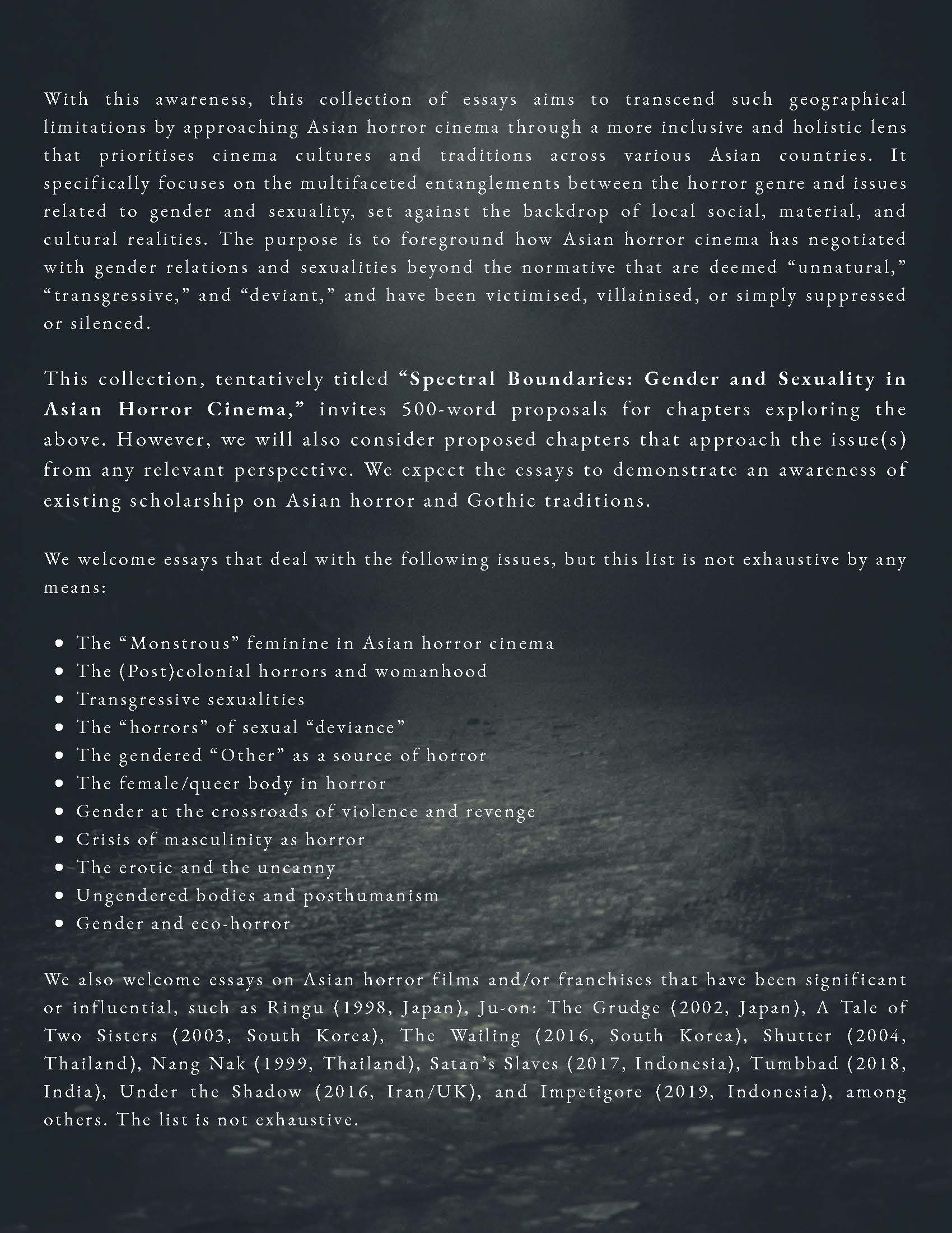 Submissions are welcome for a collection on Asian horror film – Spectral Boundaries: Gender and Sexuality in Asian Horror Film, edited by one of our members, Soumyarup Bhattacharjee, for Peter Lang.